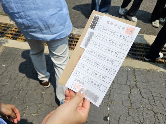 29일 오전 11시25분쯤 서울 서대문구 옛 신촌동주민센터 사전투표소에서 한 유권자가 신분 확인 후 배부받은 투표용지를 들고 투표소 밖에서 기표 순서를 기다리고 있다. [사진 매일경제]