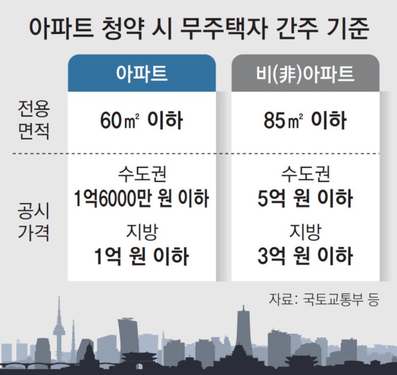 과거엔 아파트와 비아파트 무주택자 인정 기준이 같았습니다. 정부는 지난해 12월 18일부터 비아파트 기준만 완화했습니다. 전세사기 여파로 얼어붙은 비아파트 시장을 살리기 위한 인센티브 차원이었습니다. 무주택자 인정 기준은 민영주택 청약은 물론 공공주택 분양을 받을 때도 똑같이 적용됩니다.