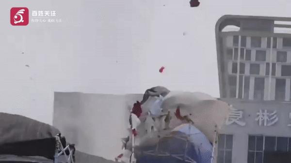 [뉴시스] 27일(현지 시각) 중국 산둥성 농산물 시장의 노점이 갑작스러운 토네이도로 인해 날아가고 있다. (사진=백성관주(百姓?注)) 2025.05.28. *재판매 및 DB 금지