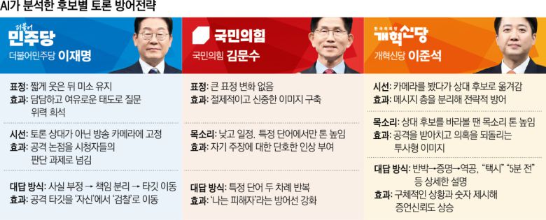 AI는 이재명 더불어민주당 대선 후보에겐 '여유로운 반격', 김문수 국민의힘 후보 '키워드 반복', 이준석 개혁신당 후보 '메시지 분리' 전략이 드러난다고 분석했다.