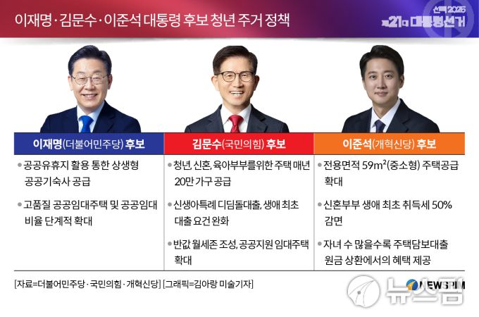 [서울=뉴스핌] 정영희 기자 = 6·3 대통령 선거에 나선 주요 후보들이 청년 유권자를 사로잡기 위한 전략으로 공급 확대와 세제 완화 등을 강조했다. 실현 시 20·30세대의 효과적인 주거 사다리가 될 수 있으나, 주택 공급에 활용할 수 있는 재원과 지난 정부의 실적을 감안했을 때 현실적으로 다소 무리가 있다는 예측이 나온다.