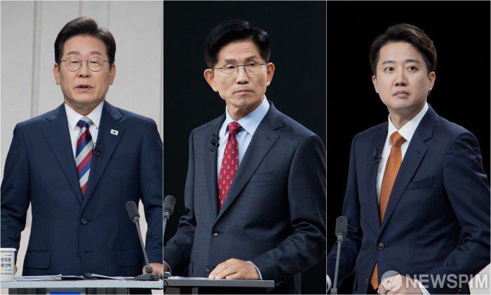 [서울=뉴스핌] 국회사진기자단 = 이재명 더불어민주당(왼쪽 부터) · 김문수 국민의힘 · 이준석 개혁신당 대선 후보가 27일 서울 상암 MBC스튜디오에서 열린 21대 대선후보 3차 토론회에 참석해 자리하고 있다. 2025.05.27 photo@newspim.com