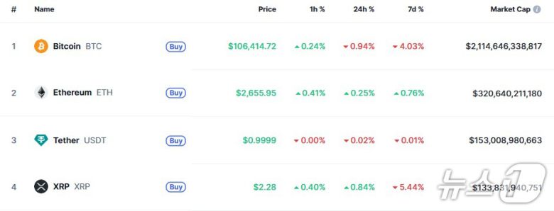 30일 오전 7시 현재 글로벌 코인 시황 중계사이트인 코인마켓캡에서 비트코인은 24시간 전보다 0.94% 하락한 10만6414달러를 기록하고 있다.