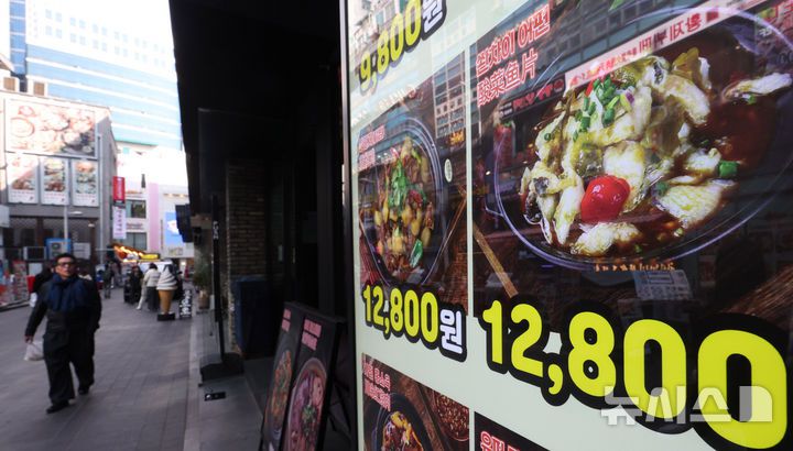 [서울=뉴시스] 추상철 기자 = 사진은 지난 3월 6일 오후 서울 중구 명동의 한 음식점 앞에 각종 음식 메뉴 가격이 적혀 있는 모습. 2025.03.06. scchoo@newsis.com |