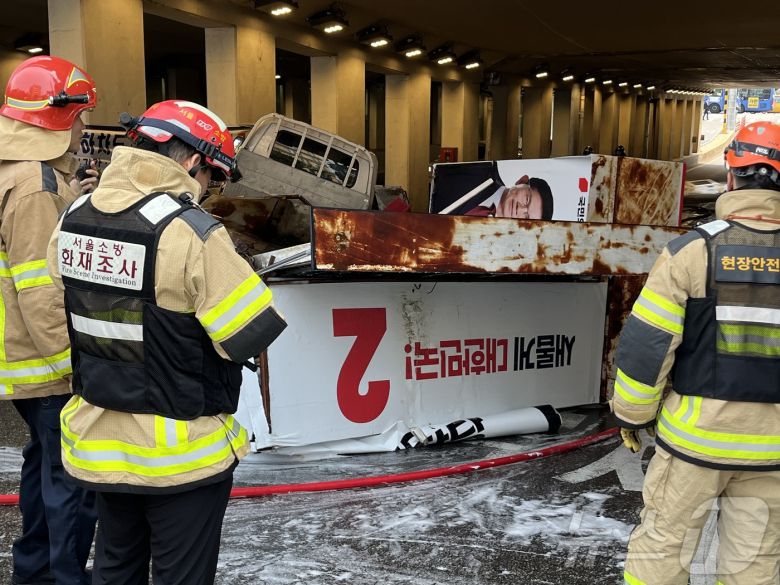 (서울=뉴스1) 김종훈 기자 = 30일 오전 서울 용산구 갈월지하차도에 진입한 선거 유세차량이 천장에 부딪치면서 전복되는 사고가 발생했다. 이 사고로 차량에 설치된 발전기에 화재가 발생해 소방 관계자들이 진화작업을 벌였다. 2025.5.30/뉴스1 Copyright ⓒ 뉴스1. All rights reserved. 무단 전재 및 재배포, AI학습 이용 금지.이 기사의 카테고리는 언론사의 분류를 따릅니다.0공유하기