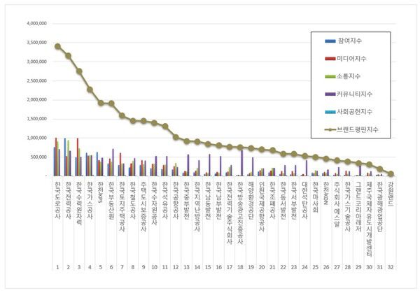 공기업 브랜드평판 1위를 기록한 한국도로공사 브랜드는 참여지수 762,132 미디어지수 1,007,135 소통지수 915,244 커뮤니티지수 706,677 사회공헌지수 19,659가 되면서 브랜드평판지수 3,410,846으로 분석됐다. 지난 4월 브랜드평판지수 1,533,336과 비교해보면 122.45% 상승했다.