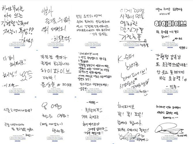 여기에 “이렇게 귀여운 초능력자들이라니, 오늘 즐거움을 이식받고 갑니다!”(배우 박보영), “다 같이 ‘하이파이브’!! 화이팅!”(배우 이도현), “깔깔깔 웃다가 즐겁게 보고 갑니다. ‘하이파이브’ 대박!”(유튜브 크리에이터 겸 배우 문상훈), “강형철 감독님의 영화에 대한, 영화에 의한 ‘시네마’의 사랑을 한껏 느낀 영화. 이재인 배우님을 비롯한 모든 배우님들의 열연도 최고!”(배우 심은경), “K-슈퍼 히어로 ‘하이파이브’! 시간 순삭 대유잼”(배우 천우희), “강형철 감독님 또 초능력 쓰셨네요! 안 웃고 못 배기게 하는 초능력!”(배우 박진주), “시즌 2 언제 나와요? 극장 나오자마자 또 보고 싶은 영화”(배우 이혜리), “올여름 최고의 영화! 배꼽 어디 갔누~” (배우 박세완), “취향 저격! 저의 히어로는 ‘하이파이브’ 그대들입니다!”(배우 이선빈), “꼭! 꼭! 꼬옥! 보셔야 합니다. 파워 에너지 충전!!”(배우 곽선영), “‘하이파이브’ 영화 보시면서 시원하고 유쾌한 여름 보내세요~!”(가수 트와이스 다현) 등 다양한 셀럽들의 폭발적인 추천 세례는 예비 관객들의 관람 욕구를 자극한다.