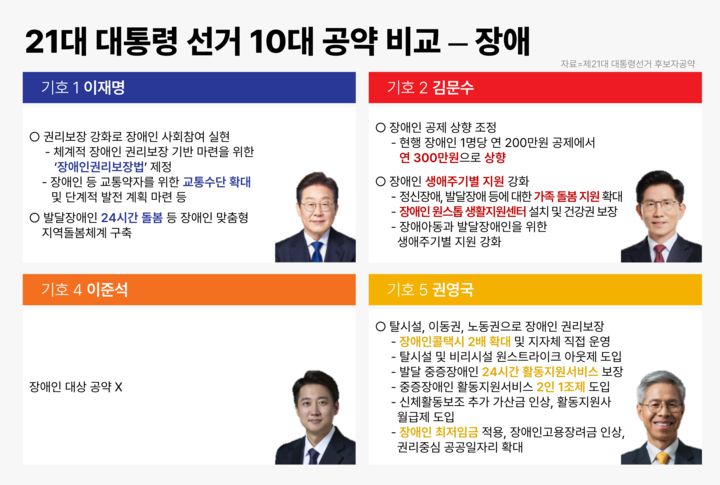 김문수(국민의힘) 후보는 생애주기별 지원 체계를 마련하고, 장애인 가족 돌봄 부담 완화를 위한 원스톱 센터 구축과 소득공제 확대를 공약으로 내세웠다.