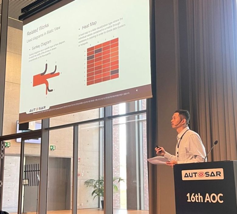 현대오토에버는 지난 27~28일(현지시간) 벨기에 브뤼허에서 열린 '오토사 오픈 콘퍼런스(AOC)'에 참가했다. 차량전장SW센터 박준현 책임이 시각화에 기반한 SW 품질 개선 방안을 발표하고 있다. 현대오토에버 제공 |
