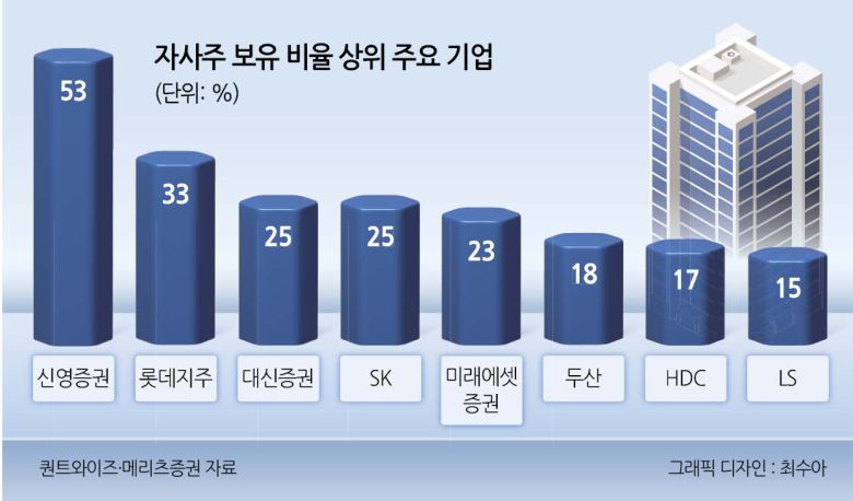 증권주 중에선 52%를 기록한 신영증권이 다른 종목과 비교하기 힘들 정도로 높은 자사주 보유 비율을 기록한 가운데, 대신증권(25%), 미래에셋증권(23%) 등도 상위권을 차지했다. 각 종목은 높은 자사주 보유 비율에 차기 정부의 증시 부양책에 대한 기대감까지 주가에 호재로 작용한 모양새다. 미래에셋증권, 신영증권, 대신증권 주가는 전날 종가 기준으로 올해 들어서만 각각 70.24%, 44.34%, 29.12%씩 올랐다.