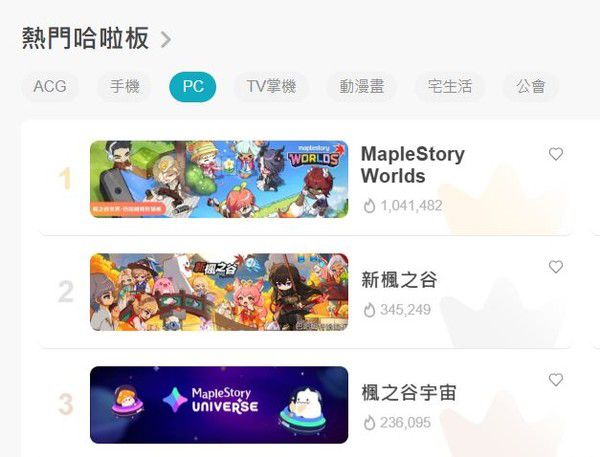 글로벌 출시 이후 '메이플스토리 월드'는 대만 현지 온라인 커뮤니티 '바하무트'에서 인기 순위 1위를 차지하고 '인기지수 100만'을 돌파하는 기록을 세웠다. 같은 시기 인기 순위 2위와 3위도 '메이플스토리' 관련 콘텐츠가 석권했다.