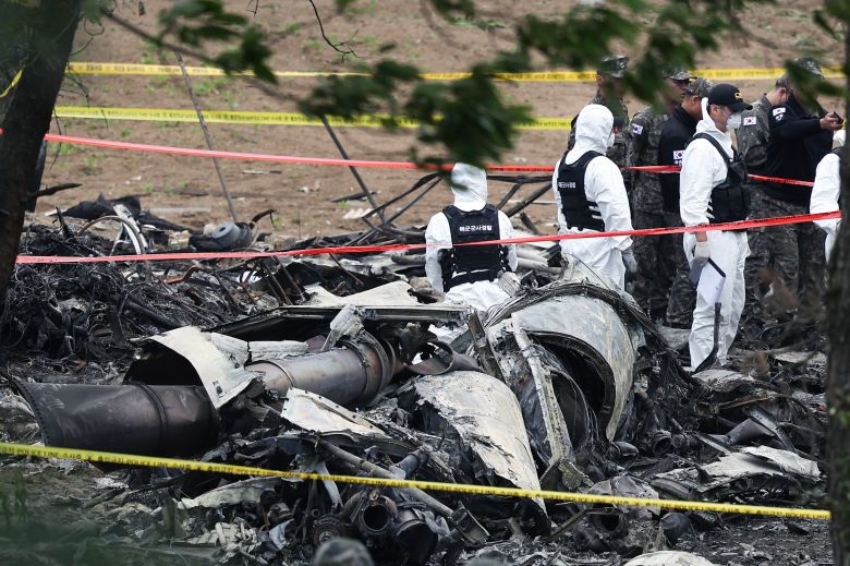 군 항공사고 조사관들이 30일 오전 경북 포항시 남구 동해면 야산에 추락한 해군 대잠 해상초계기 사고 현장 조사를 진행하고 있다. /뉴스1