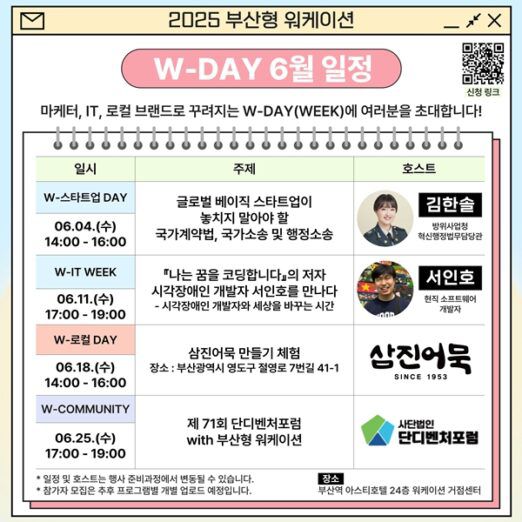 이에 대해 문경륜 PM은 “6월 W-DAY는 각기 다른 분야의 인사이트를 한 달 간 압축해 경험할 수 있는 기회”라며 “비즈니스 협업뿐 아니라 지역 자원과 연계된 콘텐츠 체험과 협업 커뮤니티 행사를 통해 지속 가능성 있는 네트워킹의 장을 느낄 수 있을 것”이라고 전했다.