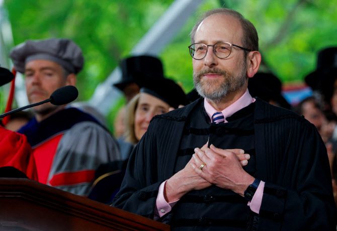 29일(현지시간) 미국 매사추세츠주 케임브리지에 위치한 하버드대학교에서 열린 제374회 졸업식 도중, 앨런 가버 하버드대학교 총장이 학생들의 지속적인 박수에 화답하며 반응하고 있다.(사진=로이터) |