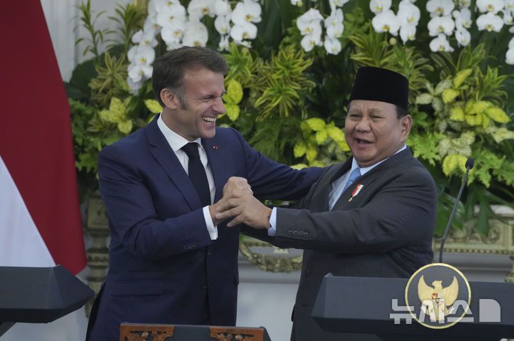 [자카르타=AP/뉴시스] 에마뉘엘 마크롱(왼쪽) 프랑스 대통령과 프라보워 수비안토 인도네시아 대통령이 28일(현지 시간) 인도네시아 자카르타의 메르데카궁에서 공동 기자회견을 마친 후 웃으며 손을 잡고 있다. 2025.05.30.