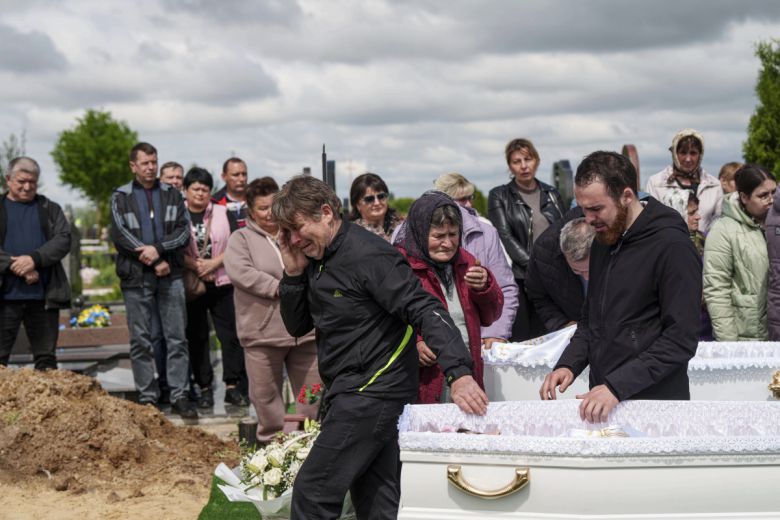 우크라이나 코로스티시우에서 28일(현지시간) 러시아 공습으로 사망한 사람들의 장례식이 진행되고 있다. 코르스티시우(우크라이나)/AP연합뉴스