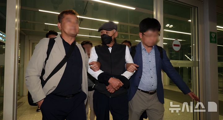 [인천공항=뉴시스] 김선웅 기자 = 해외도피로 조세포탈 재판에 불출석한 대주그룹 허재호 전 회장이 강제 구인 절차로 송환돼 27일 인천국제공항을 통해 귀국, 압송되고 있다. 2025.05.27. mangusta@newsis.com
