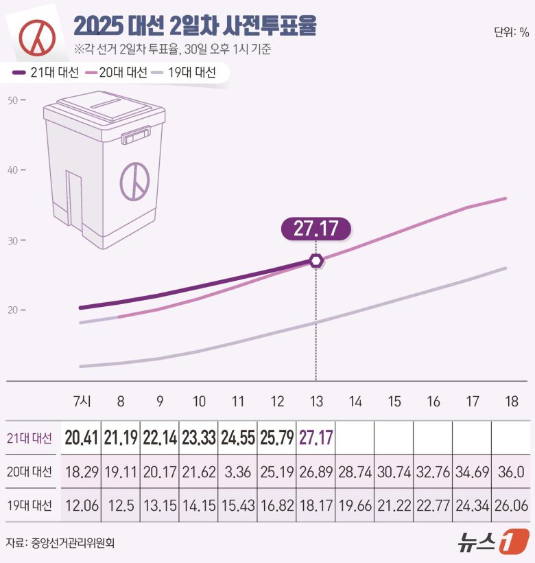 21대 대통령 선거 사전투표 둘째날인 30일 오후 1시 현재 투표율이 27.17%로 동시간대 기준 역대 최고 기록으로 집계됐다. 중앙선거관리위원회에 따르면 이날 오전 6시부터 진행된 사전투표에서 전체 유권자 4439만1871명 가운데 1206만3051명이 투표를 마쳤다. ⓒ News1 윤주희 디자이너 |