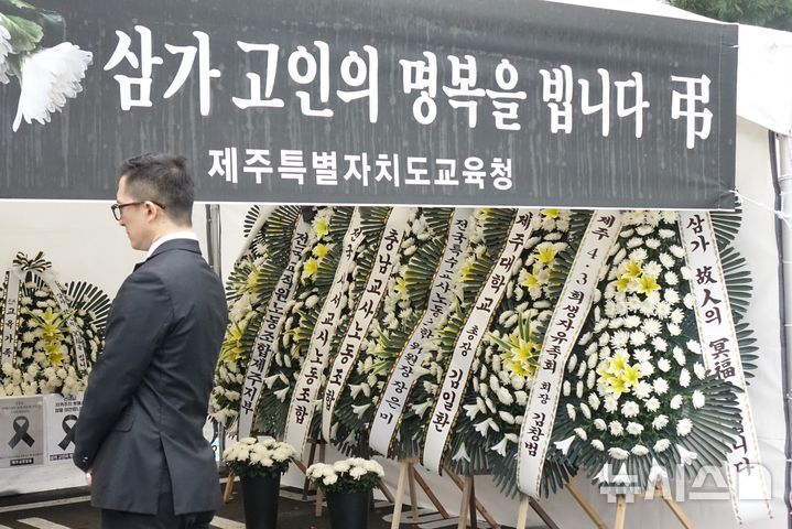 [제주=뉴시스] 양영전 기자 = 23일 오후 제주시 연동 제주도교육청 앞마당에 제주 한 중학교에서 숨진 교사의 분향소가 마련된 가운데 조문객들의 발걸음이 이어지고 있다. 2025.05.23. 0jeoni@newsis.com
