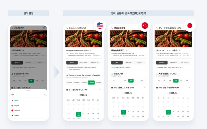 네이버는 지난 29일 외국어 지원 방식 변경과 외국인 손님 받기 설정을 오픈했다. 기존에는 예약 기본 정보, 상품명, 옵션명을 영어로 직접 입력하거나 자동 번역 후 '외국어 설정'을 'ON'으로 설정하면 브라우저 언어가 영어인 사용자에게 해당 내용이 영어로 제공됐다. 개편 후에는 영어, 일본어, 중국어(간체) 등 총 3가지 언어를 네이버 파파고 자동 번역으로 제공한다.