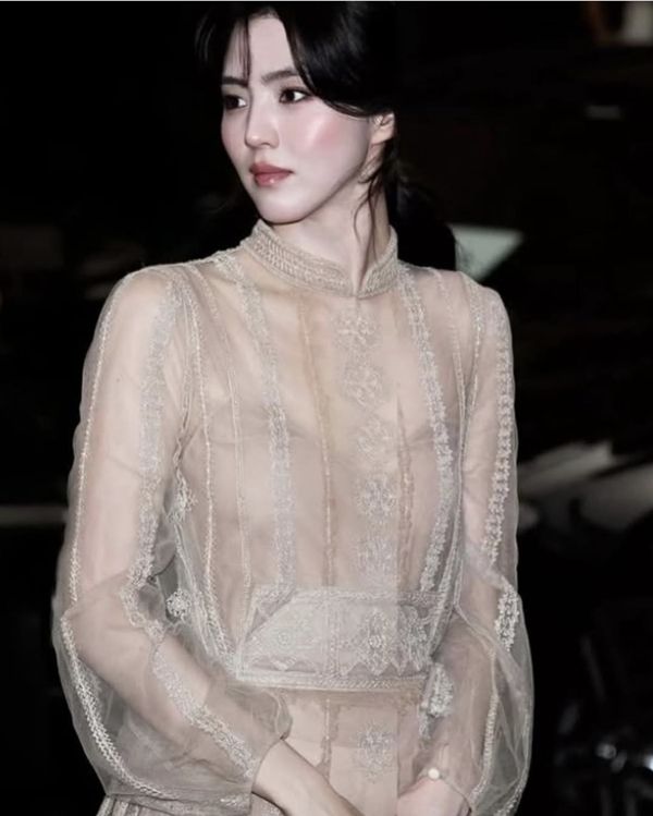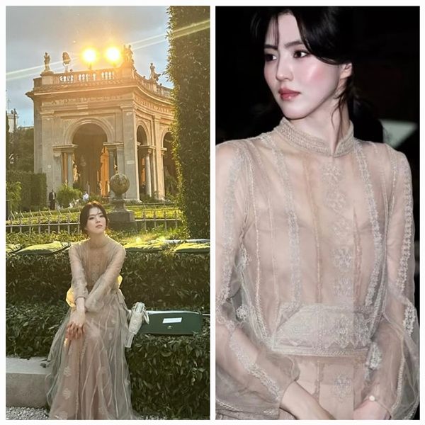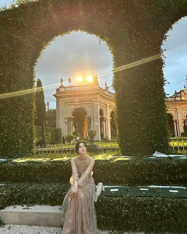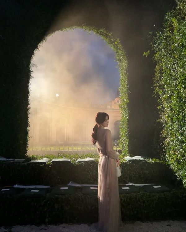 사진 속 한소희는 아이보리 톤의 시스루 드레스를 입고, 로마의 고풍스러운 정원과 석조 건축물 사이를 거닐고 있다. 드레스는 전신을 부드럽게 감싸는 튤 소재와 자수 레이스가 어우러져, 고대 로마 여신 조각을 연상케 하는 우아한 실루엣을 연출했다.