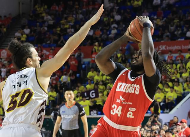 자밀 워니가 은퇴 의사를 접고 SK에서 1시즌 더 뛰기로 했다. 사진은 워니(오른쪽)가 17일 LG와 챔피언 결정 7차전에서 LG 아셈 마레이의 블록을 피해 슛을 시도하고 있는 모습. LG의 우승 주역 마레이도 구단과 재계약했다. 연합뉴스