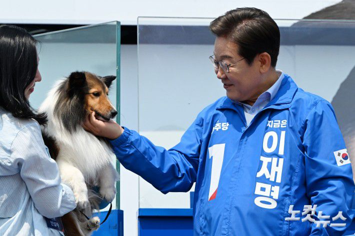 이재명 더불어민주당 대선 후보가 30일 오후 강원 춘천시 춘천역 광장에서 열린 집중유세에서 강아지를 만지고 있다.