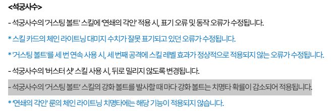 석궁사수의 '거스팅 볼트' 스킬의 치명타 확률이 감소된다. 본래 치명타에 스탯 올인을 할 만큼 중요했던 만큼 유저 입장에서는 상당히 아쉬운 대목이다. 여전히 다른 직업에 비해 치명타 효율이 뛰어난 편이지만 상당히 아쉬운 대목이다.