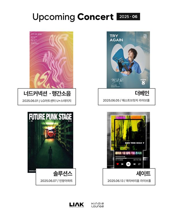 초여름이 시작되는 6월에는 다양한 개성을 지닌 아티스트들의 공연이 예정되어 있다. 한국음악레이블산업협회(음레협)가 운영하는 킨디라운지는 관객과의 밀접한 소통, 공간을 활용한 실험적 시도, 정규 앨범 발표 등 뚜렷한 주제를 중심으로 한 6월의 주요 공연들을 소개한다.