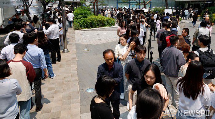 [서울=뉴스핌] 류기찬 인턴기자 = 제21대 대선 사전투표 둘째날인 30일 오전 서울 강남구 역삼1동주민센터에 마련된 사전투표소 앞에 직장인들이 점심시간을 이용해 투표하기 위해 줄을 서고 있다. 2025.05.30 ryuchan0925@newspim.com |