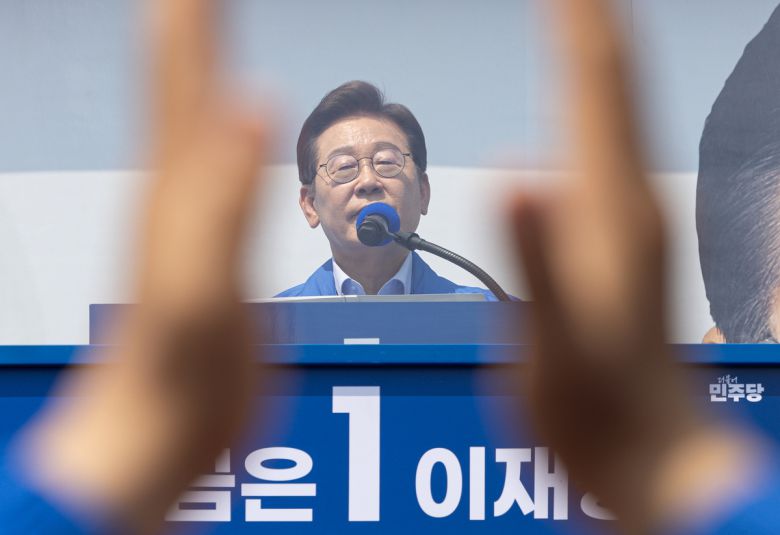 이재명 더불어민주당 대선후보가 30일 오후 강원 춘천시 춘천역 광장에서 열린 집중유세에서 연설하고 있다. 공동취재