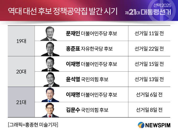 19대 대선에 나선 문재인 더불어민주당 후보는 선거일 11일 전, 홍준표 자유한국당 후보는 선거일 22일 전에 정책 공약집을 발간했습니다. 20대 대선에서 이재명 더불어민주당 후보는 선거일 15일 전, 윤석열 국민의힘 후보는 선거일 13일 전 정책 공약집을 내놨습니다.
