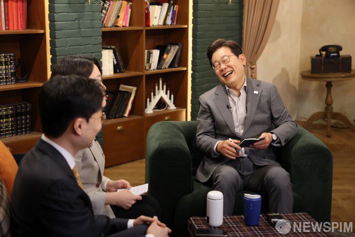 [서울=뉴스핌] 정일구 기자 = 이재명 더불어민주당 대선 후보가 28일 서울 강남구의 한 스튜디오에서 열린 K-이니셔TV '1400만 개미와 한배 탔어요' 유튜브 라이브에서 웃고 있다. 2025.05.28 mironj19@newspim.com |