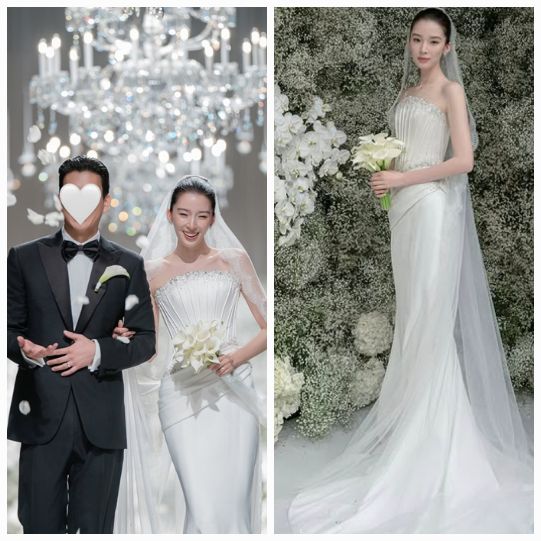 보디라인을 감싸는 실루엣, 은은한 크리스털 장식, 드레스를 휘감는 롱 트레인까지 완성된 장면은 말 그대로 화보였다. 신랑은 얼굴을 하트 이모티콘으로 가린 채 등장했지만, 슬림한 블랙 턱시도와 훈훈한 분위기로 존재감을 전했다.