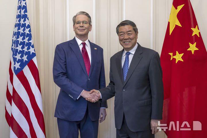 [제네바(스위스)=AP/뉴시스]스콧 베센트 미 재무장관(왼쪽)이 지난 10일 토요일 스위스 제네바에서 열린 미-중 회담에서 허리펑(何立峰) 중국 부총리와 악수하고 있다. 베센트 장관은 "미·중 무역협상은 '약간 교착 상태'에 빠져 있으며 도널드 트럼프 대통령과 시진핑(習近平) 중국 국가주석의 통화로 다시 활기를 불어넣을 필요가 있을 것"이라고 말했다고 파이낸셜 타임스(FT)가 30일 보도했다. 2025.05.30.