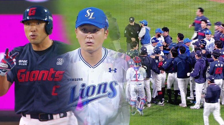 삼성 투수 최원태 선수의 공에 롯데 전준우 선수가 맞자, 양 팀 선수들이 그라운드로 뛰어나옵니다. 롯데와 삼성은 이렇게 4분 정도 맞섰는데요. 이 벤치클리어링은 경기의 흐름마저 바꿔놓았습니다.