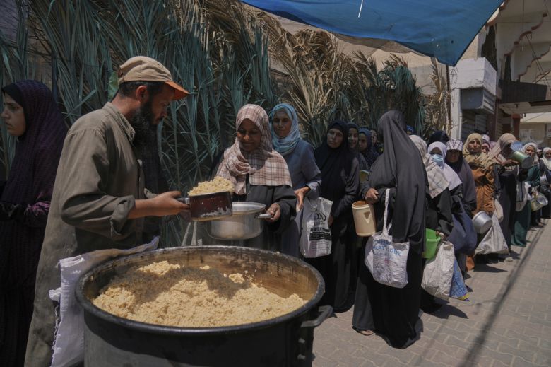 30일 가자지구에서 팔레스타인 여성이 음식을 배급받고 있다. AP연합뉴스 |