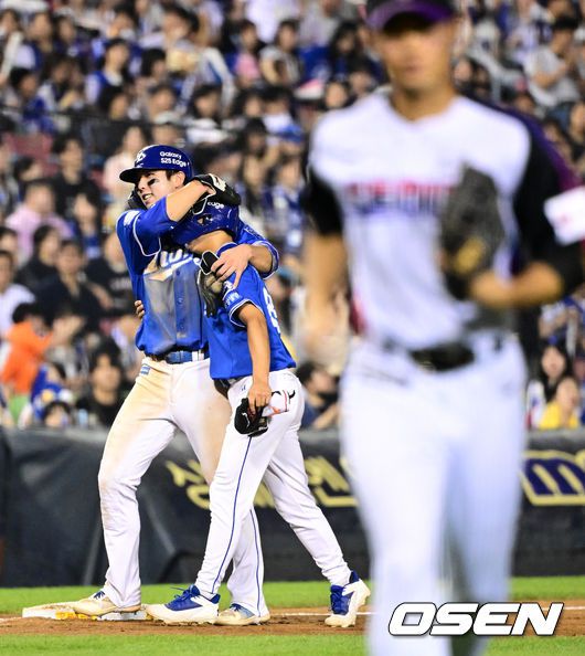 [OSEN=잠실, 지형준 기자] 30일 오후 서울 잠실구장에서 ‘2025 신한 SOL Bank KBO리그’ LG 트윈스와 삼성 라이온즈의 경기가 열렸다. 이날 LG는 엘리에이저 에르난데스, 삼성은 이승현을 선발투수로 내세웠다. 8회초 공격을 마치고 삼성 김영웅이 2사 만루에서 2타점 우전 적시타를 날린 양도근을 안아주고 있다. 2025.05.30 /jpnews@osen.co.kr 이 기사의 카테고리는 언론사의 분류를 따릅니다.0공유하기