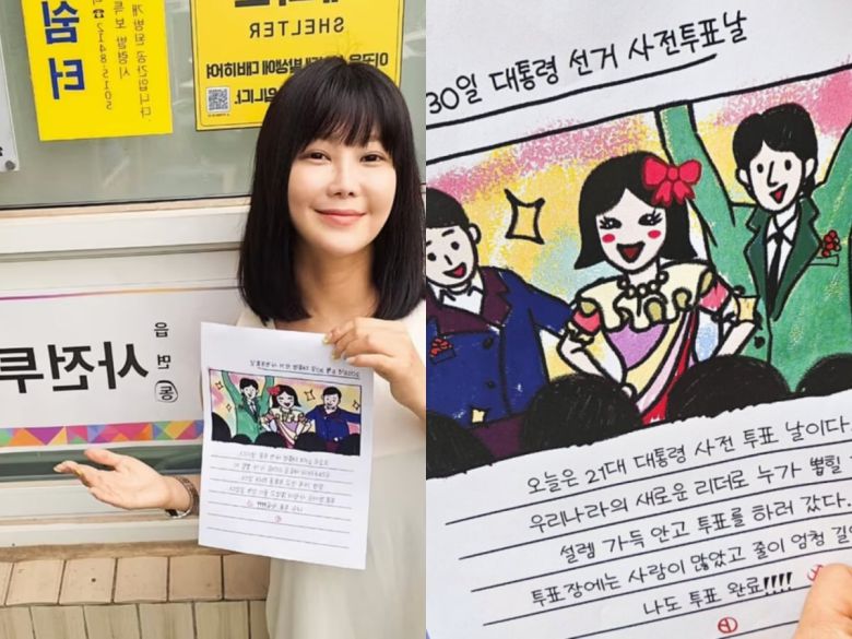 솔비는 30일 자신의 인스타그램을 통해 "사전투표 완료"라는 짧은 글과 함께 여러 장의 사진을 올렸다. 공개된 사진에는 솔비가 사전투표소 앞에서 투표를 마친 뒤 직접 만든 그림일기 형태의 인증 도구를 들고 있는 모습이 담겼다.