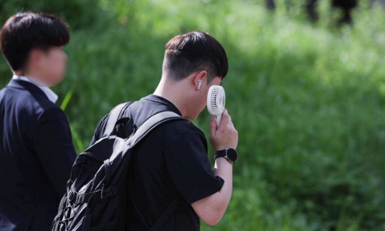 여름 기운이 돌기 시작하는 절기 '소만'인 지난 21일 서울 종로구 일대에서 반팔을 입은 시민이 손선풍기를 사용하며 출근하고 있다. 뉴스1