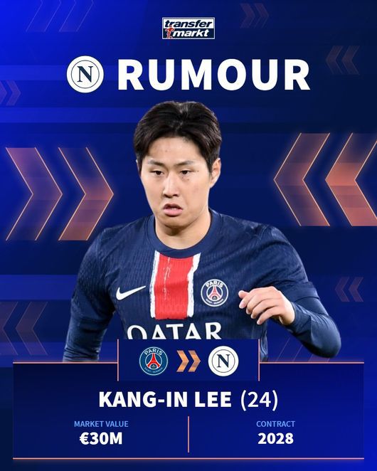 매체는 "이강인의 몸값은 3000만 유로(약 470억 원) 정도지만, 아우렐리오 데 라우렌티스 나폴리 회장이 스스로 정한 기준에 부합하는 선수다. 그는 나폴리 공격진의 전력을 강화할 수 있다"라며 "만나 디렉터가 앞으로 며칠 안에 이 뛰어난 선수 영입을 밀어붙일 가능성이 있다"라고 덧붙였다.