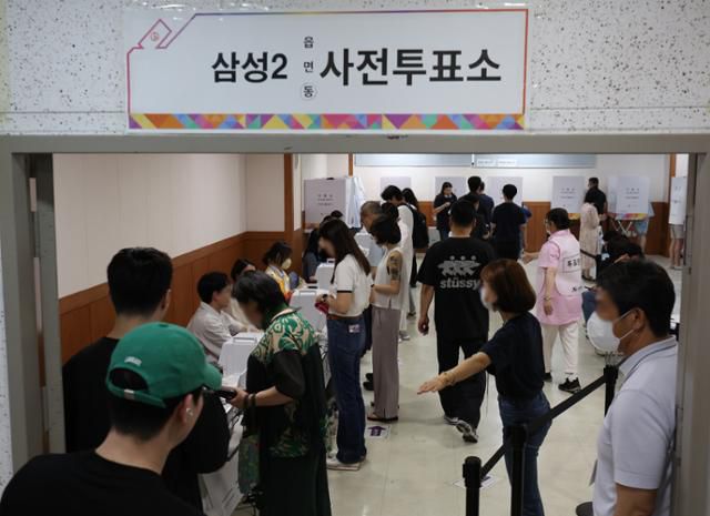 21대 대통령선거 사전투표 둘째날인 30일 오후 서울 강남구 삼성2동 주민센터에 마련된 사전투표소에서 유권자들이 투표를 하기 위해 줄서 기다리고 있다. 뉴시스 |
