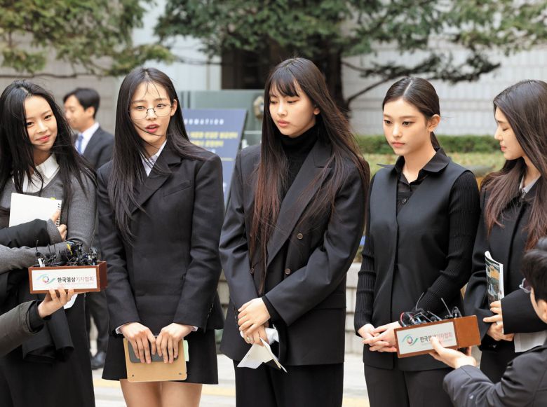 지난 3월 서울 서초구 서울중앙지법 앞에 선 걸그룹 뉴진스(왼쪽부터 하니, 민지, 혜인, 해린, 다니엘). /뉴스1
