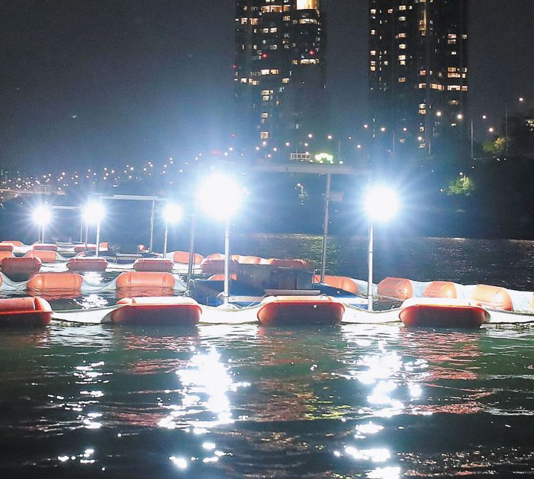 29일 오후 9시 서울 성동구 영동대교 인근. 어둠이 깔린 잔잔한 한강 위에 오징어잡이 배처럼 생긴 가로 1.5m, 세로 1.5m 크기의 바지선 3척이 떴다.