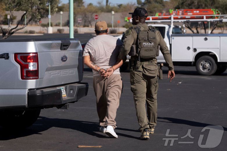 미국 애리조나주 투손에서 미 이민세관단속국의 대원이 불법 이민자를 체포해 연행하고 있다. 2025.01.26 ⓒ 로이터=뉴스1 ⓒ News1 정지윤 기자 |