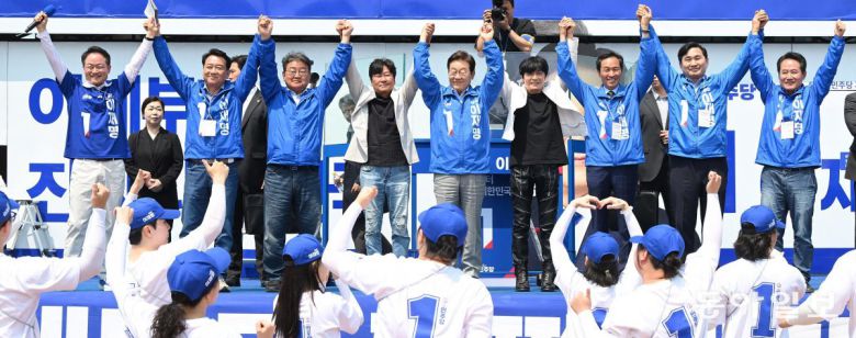 더불어민주당 이재명 대선 후보(첫 번째 줄 왼쪽에서 다섯 번째)가 30일 강원 춘천시 춘천역 광장에서 당 관계자들과 손을 맞잡고 유권자들에게 지지를 호소하고 있다. 공식 선거운동이 시작된 뒤 이 후보가 강원 지역을 방문한 건 이번이 처음이다. 춘천=이훈구 기자 ufo@donga.com |