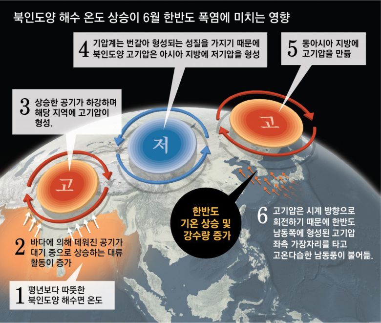 7월에는 남인도양의 높은 해수면 온도가 국내에 영향을 미친다. 북서태평양에 저기압성 순환이 강화되면서 한반도 부근으로 고기압성 순환이 생긴다. 박미영 기상청 기후예측과 기상사무관은 “남반구에 있는 남인도양의 해수 온도 상승이 어떤 원리로 한반도에 더위를 불러오는지는 아직 명확히 규명되지 않았다”며 “다만 통계적으로 남인도양의 봄 수온이 평년보다 높으면 한반도의 여름이 더 더워지는 패턴을 보였다”고 말했다.