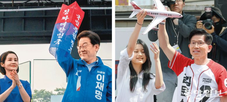 마지막 주말 유세 대선 공식 선거운동 기간 마지막 주말을 앞둔 30일 더불어민주당 이재명 대선 후보와 국민의힘 김문수 대선 후보가 나란히 충북 지역 유세에 나섰다. 이 후보는 충북 충주시 충주체육관 시계탑광장 유세에서 ‘진짜 대한민국’이라고 쓰인 청사초롱을 들어 보이고 있다(왼쪽 사진). 김 후보도 충주시 젊음의 거리에서 열린 유세에서 청년들에게 받은 비행기를 들어 보이고 있다. 충주=이훈구 ufo@donga.com·장승윤 기자