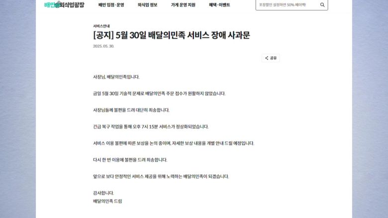 배달의민족 관계자는 일시적인 시스템 오류로 일부 기능에 장애가 발생한 거로 보인다며 이번 오류로 불편을 겪은 업주와 고객에 대한 적절한 보상 조치를 검토하고 있다고 설명했습니다.