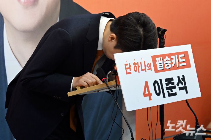 이준석 개혁신당 대통령 후보가 29일 오전 서울 여의도 국회에서 '여성 신체에 대한 표현' 논란 관련 긴급 기자회견을 마친 뒤 인사를 하고 있다. 윤창원 기자